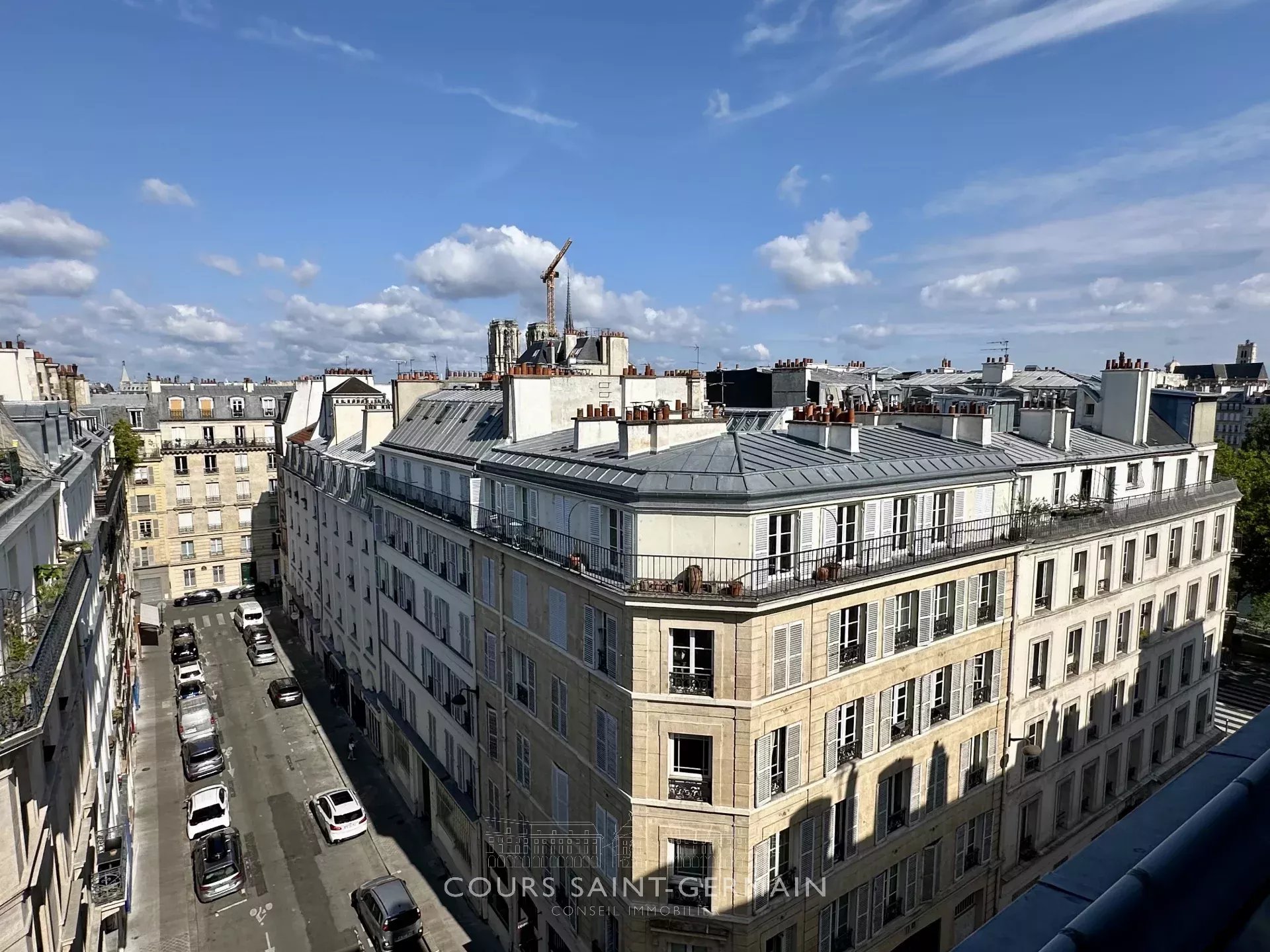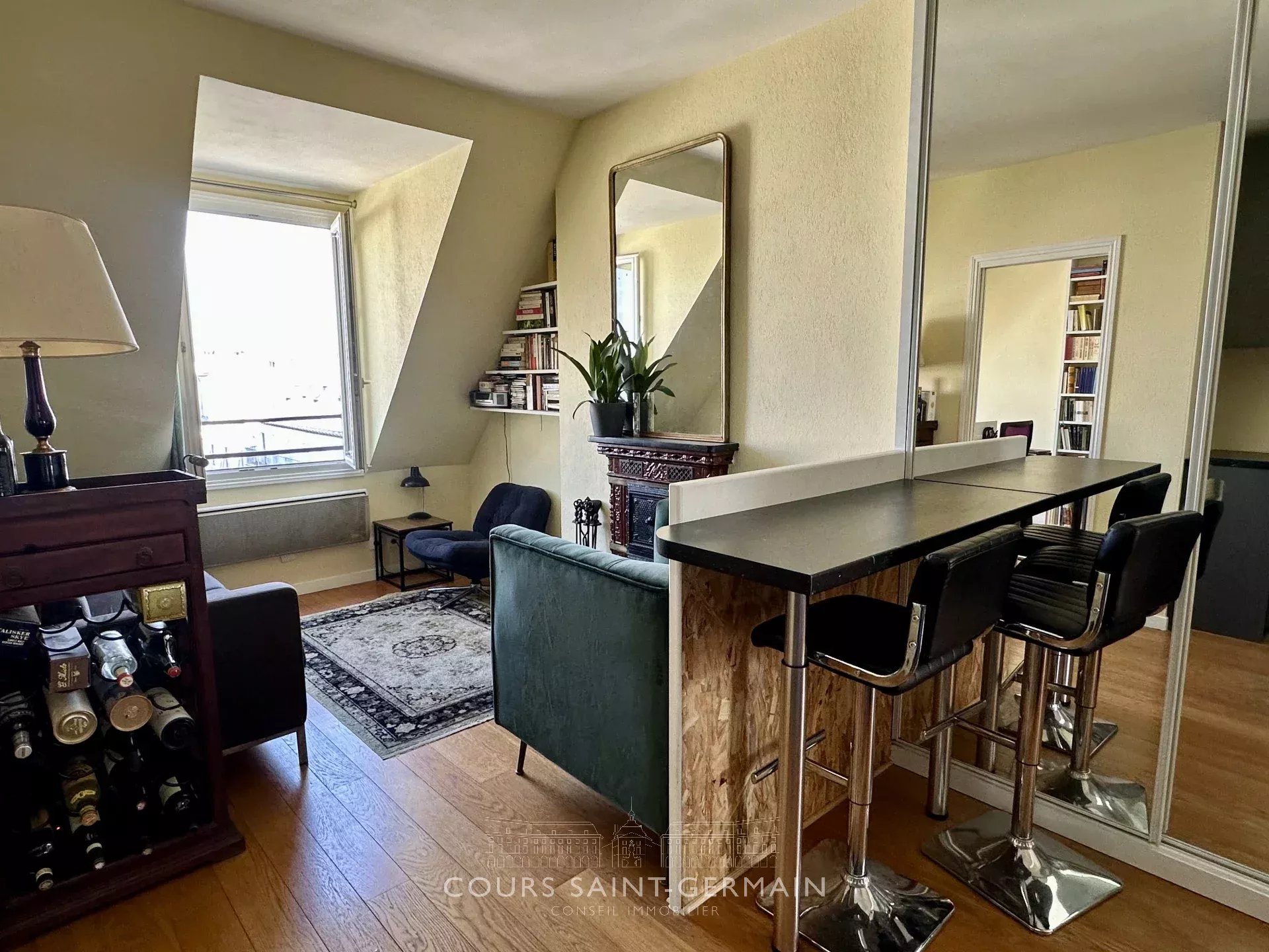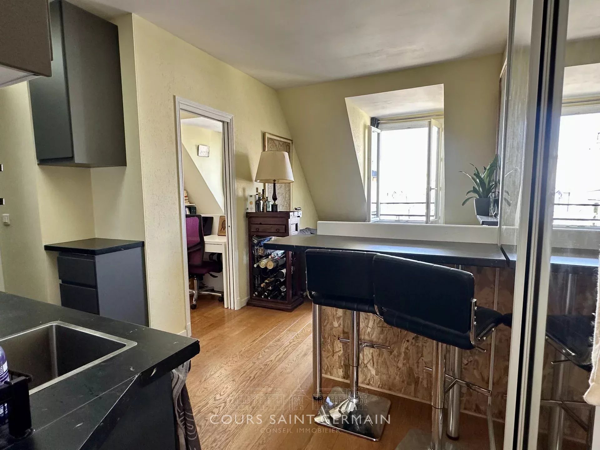 A proximité de la Seine et de l'Île Saint-Louis, dans une rue calme, 2 pièces au 6ᵉ et dernier étage d’un immeuble de 1787, 28,60 m² Carrez, au sol (31,57 m²). Un séjour avec sa cheminée prussienne fonctionnelle donnant une atmosphère chaleureuse et sa vue dégagée panoramique sur les principaux monuments parisiens. Une cuisine ouverte équipée. Une chambre avec vue dégagée panoramique. Idéal en pied-à-terre dans le centre de Paris ou un investissement. Métro Maubert Mutualité