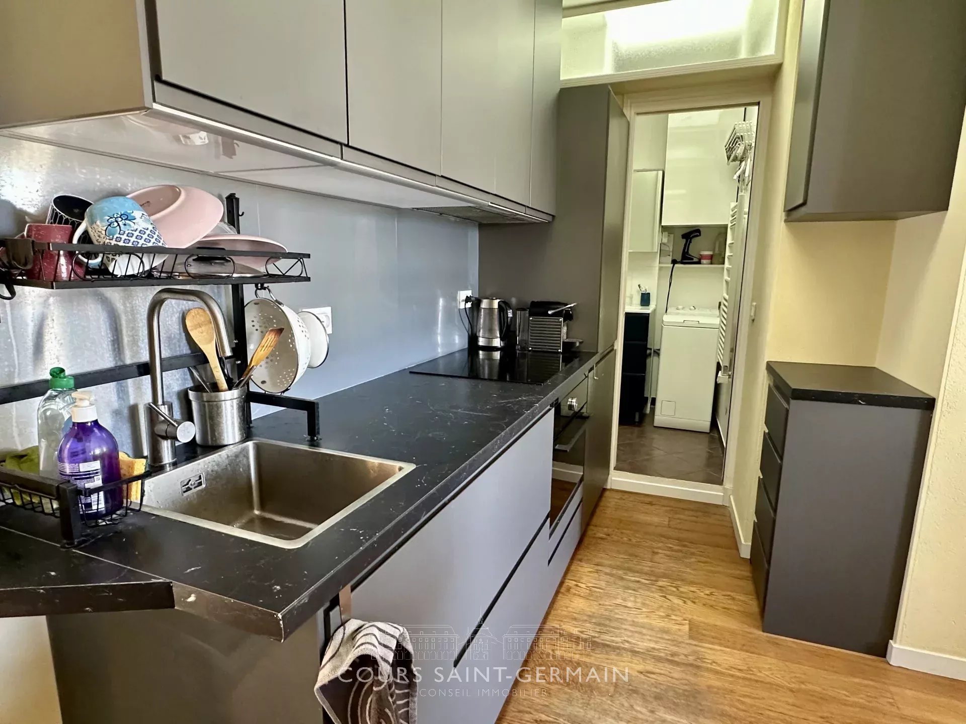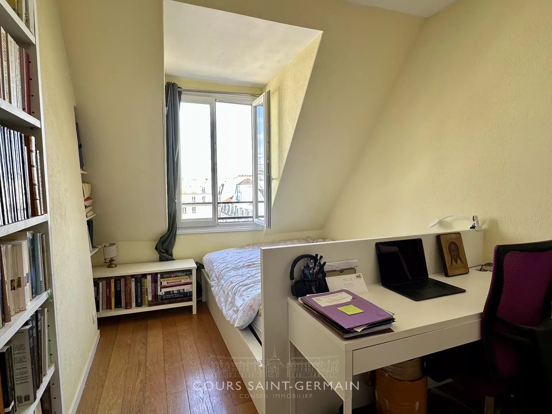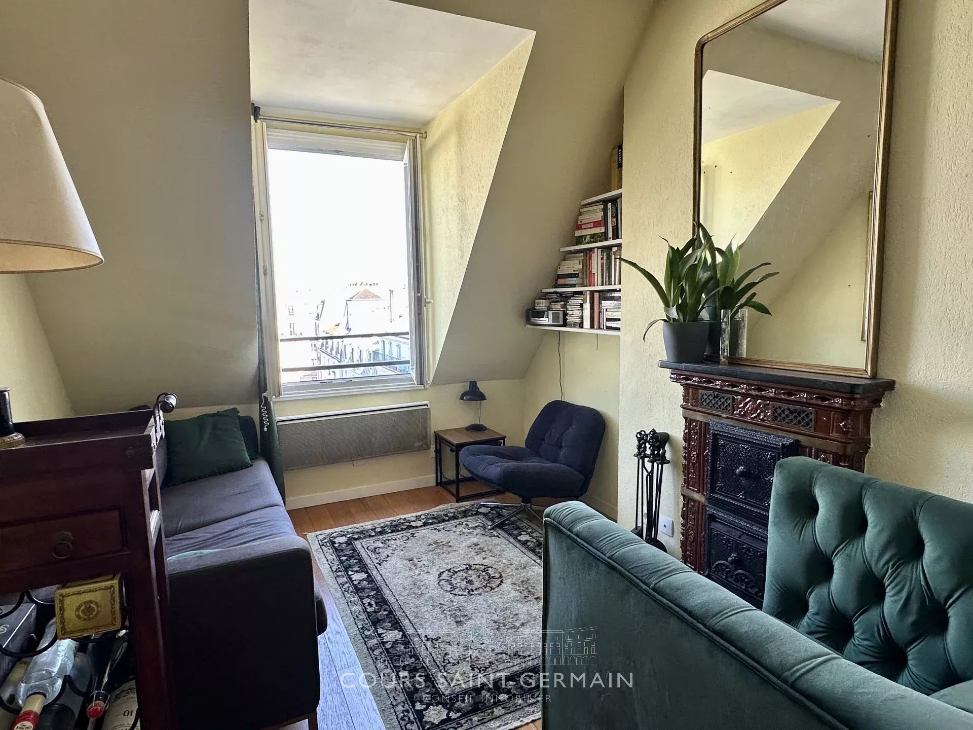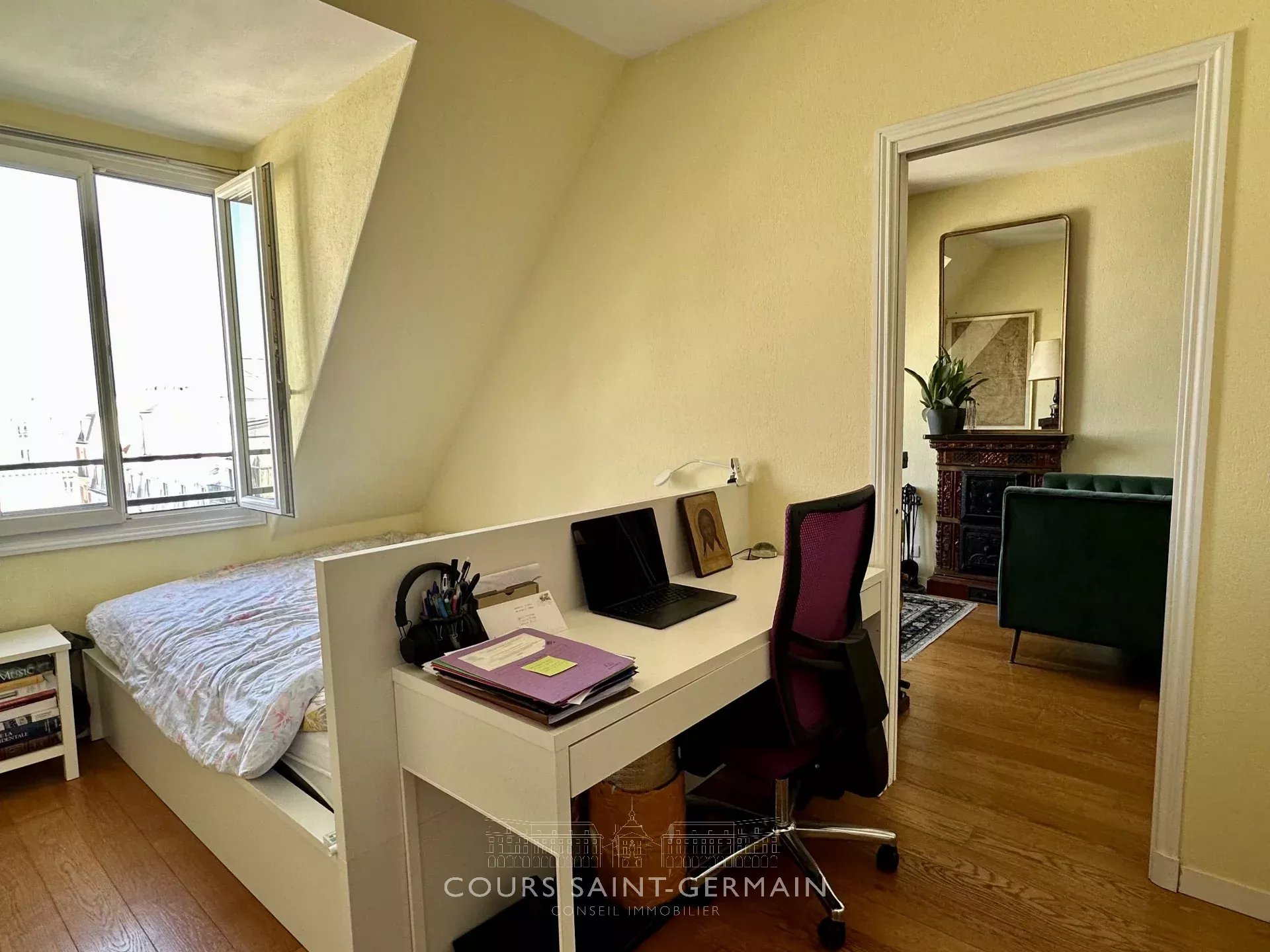 A proximité de la Seine et de l'Île Saint-Louis, dans une rue calme, 2 pièces au 6ᵉ et dernier étage d’un immeuble de 1787, 28,60 m² Carrez, au sol (31,57 m²). Un séjour avec sa cheminée prussienne fonctionnelle donnant une atmosphère chaleureuse et sa vue dégagée panoramique sur les principaux monuments parisiens. Une cuisine ouverte équipée. Une chambre avec vue dégagée panoramique. Idéal en pied-à-terre dans le centre de Paris ou un investissement. Métro Maubert Mutualité