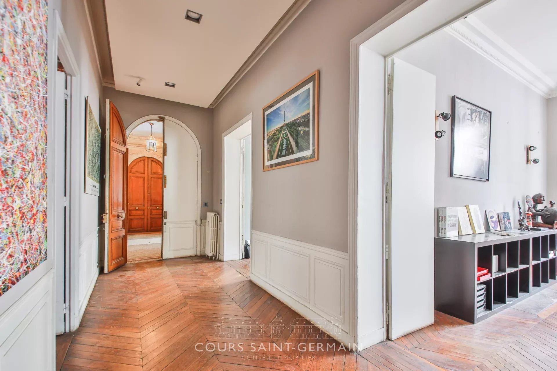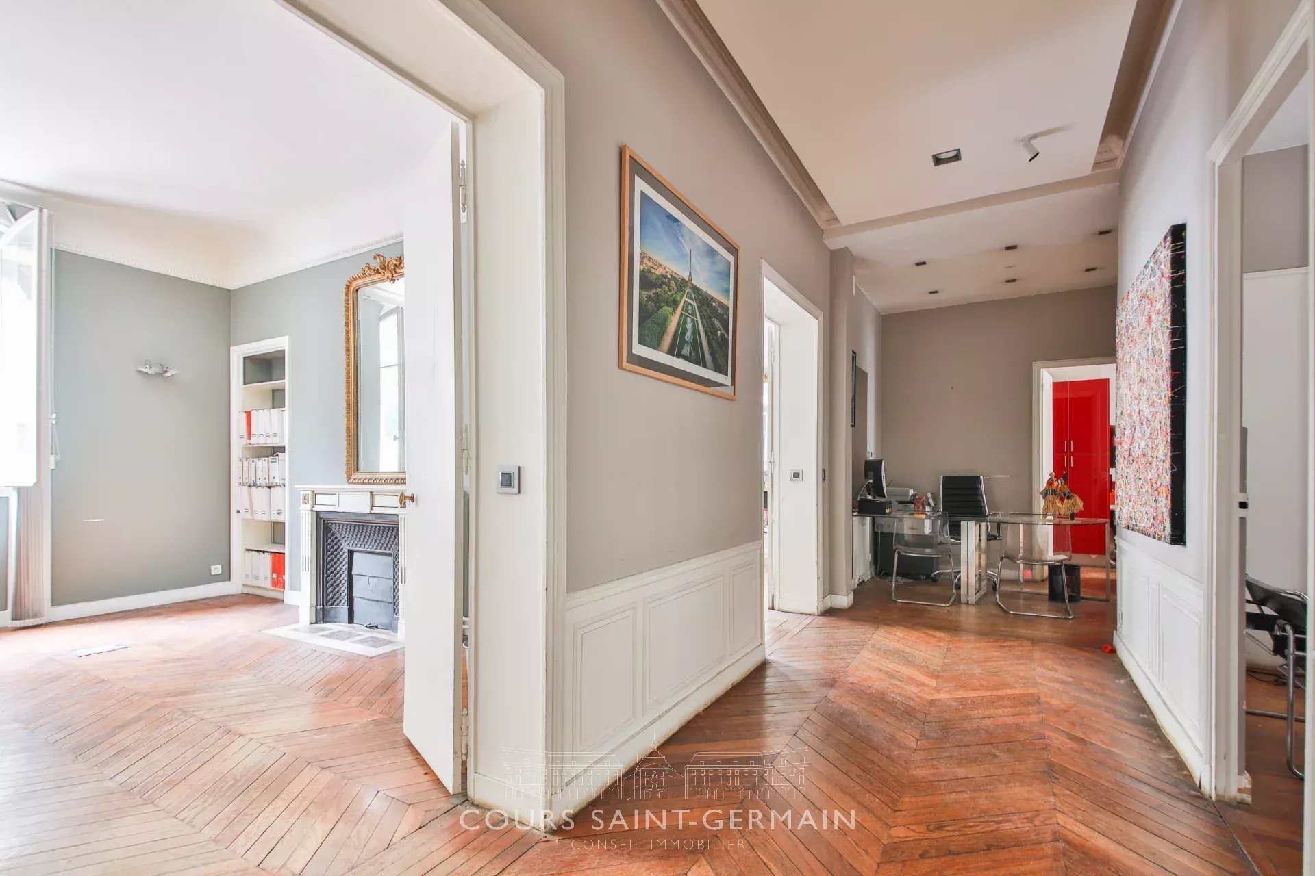 Dans un magnifique immeuble en pierre de taille du début du XXᵉ siècle, découvrez ce bien rare en rez-de-chaussée, baigné de lumière grâce à son exposition Sud-Ouest et sublimé par une hauteur sous plafond de 3,40 m. D’une surface de 111,61 m² Carrez (129 m² au sol), l’appartement se distingue par ses volumes généreux et ses multiples possibilités d’aménagement. Un aménagement de 3 chambres est envisageable. Actuellement configuré en cabinet médical, il nécessite un rafraîchissement pour révéler tout son potentiel. Il se compose de : * Une entrée majestueuse * Un double salon lumineux de près de 40 mètres carrés * 1 chambre * 1 bureau * Une salle d'attente aménageable en chambre * Une salle d'eau * 2 toilettes indépendants * Une grande cuisine * Un souplex de 17 m2 aménagé en chambre avec sa salle d'eau et ses toilettes privatifs. * L'immeuble dispose de superbes parties communes, à la hauteur de son adresse prestigieuse, et d'un service de gardiennage assurant confort et sécurité au quotidien. - Une adresse exceptionnelle : à deux pas de la rue Saint-Dominique, en face de l’hôtel de Fleury, à proximité des écoles de renom et des commerces réputés de la rue de Grenelle. - Idéal pour une famille en quête d’un lieu de vie d’exception ou pour une profession libérale souhaitant une adresse prestigieuse.