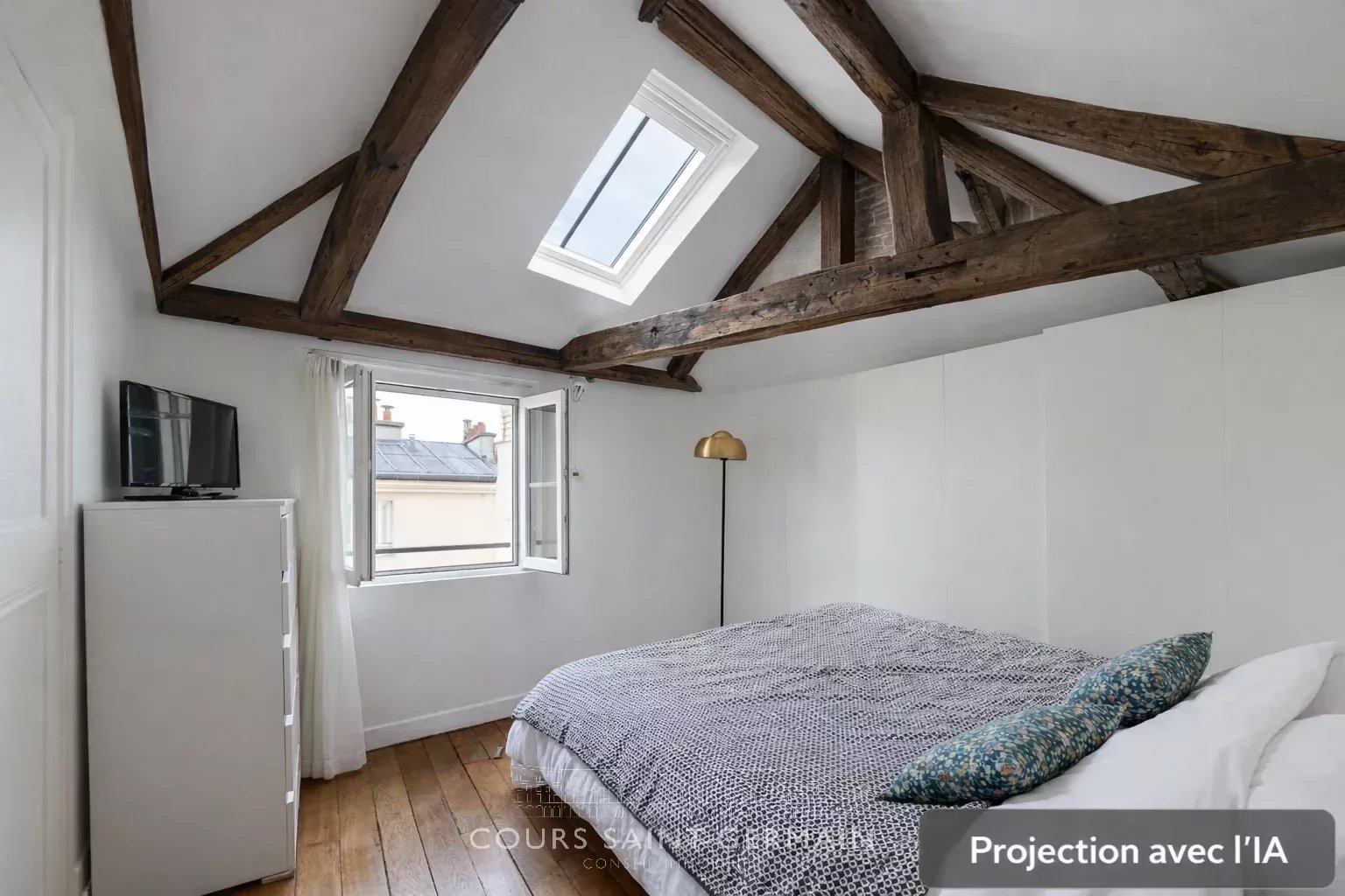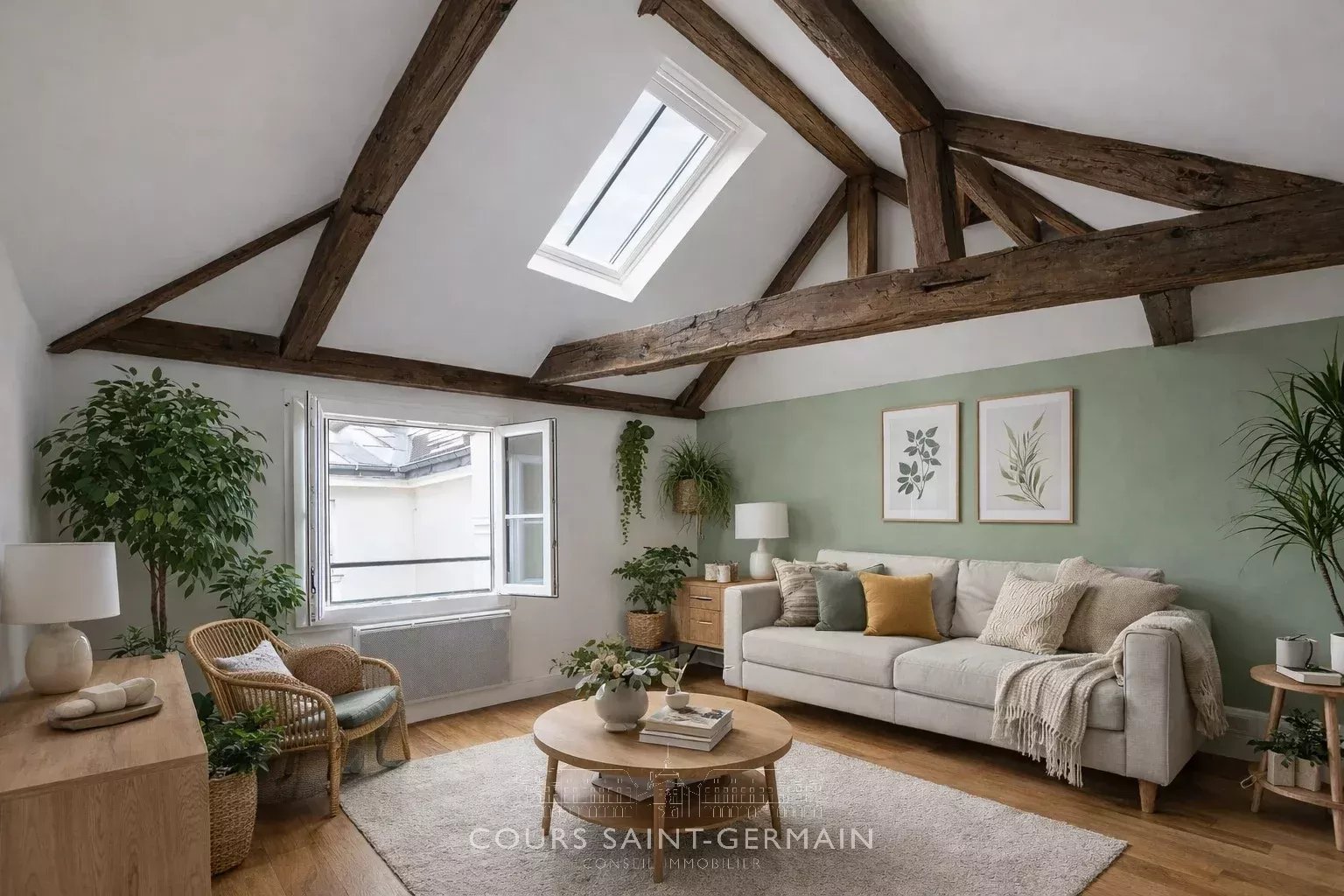 Paris 6ᵉ – Dernier étage – Vue toits – Fort potentiel Au cœur d’un quartier emblématique du 6ᵉ arrondissement, dans une rue animée mais au calme absolu sur cour, charmant 2 pièces de 34,50 m², situé au 6ᵉ et dernier étage d’un immeuble ancien. Très lumineux (exposition ouest), l’appartement offre une vue dégagée sur les toits de Paris. Belle pièce de vie lumineuse Cuisine équipée Chambre avec grands rangements intégrés Salle de bains avec WC Vendu meublé ou non, habitable immédiatement, sans travaux. Atout rare : combles aménageables inclus, accessibles directement depuis l’appartement, permettant création de mezzanine, double hauteur ou espace de rangement, avec plus de 3 m de hauteur sous plafond possible. Ascenseur : étude de faisabilité réalisée, projet techniquement réalisable (déjà installé dans les autres bâtiments de la cour). Un bien de caractère, rare sur le marché, au cœur de la Rive Gauche.